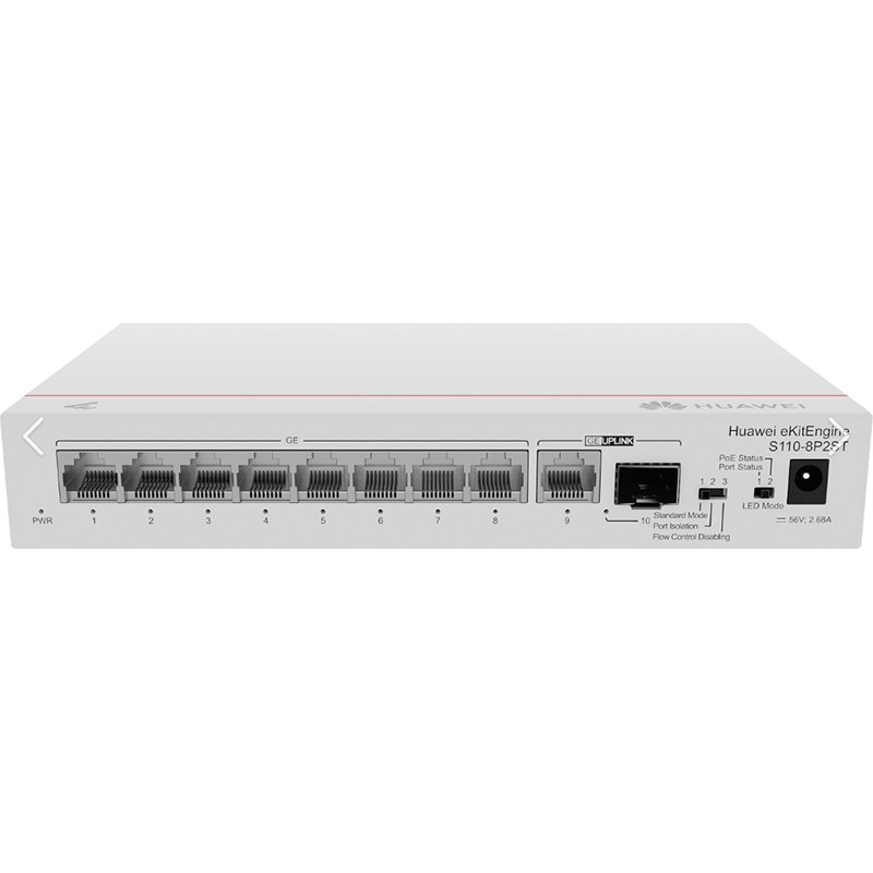 The Huawei eKitEngine S110-8P2ST is an unmanaged Gigabit Ethernet switch designed for small offices, retail environments, and SOHO setups requiring reliable Power over Ethernet (PoE+) support. With 8 PoE+ ports delivering up to 124W total PoE budget, it powers devices like IP cameras, VoIP phones, and wireless access points without the need for additional power adapters.