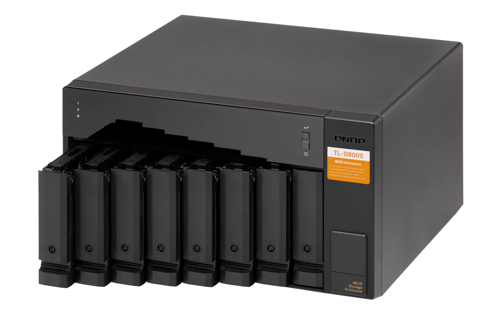 The TL-D800S features SFF-8088 (or SFF-8644) connectivity and multiple SATA 6Gb/s bays. This provides better sequential read performance and faster data transfer speeds than existing USB and eSATA expansion enclosures, while also being a more economical option compared to a QNAP REXP SAS enclosure.