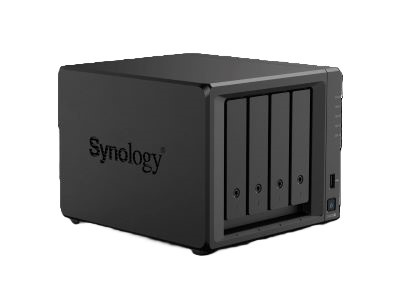 • Supports 4 × 3.5″ HDDs or 2.5″ SATA SSDs (plus compatibility per Synology’s validated drive list).