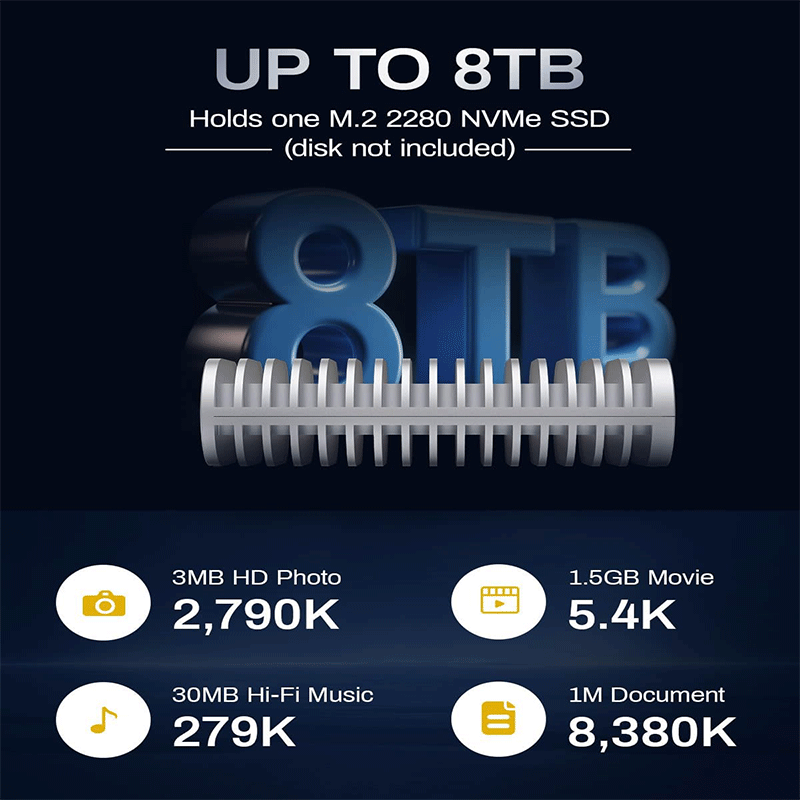 It supports M.2 NVMe SSDs (2280 size) up to 8 TB capacity (you install the SSD yourself). This means you can choose the size and performance level you want — from a fast 1 TB SSD for speed-focused workflows to a large 8 TB drive for huge media libraries or backups.