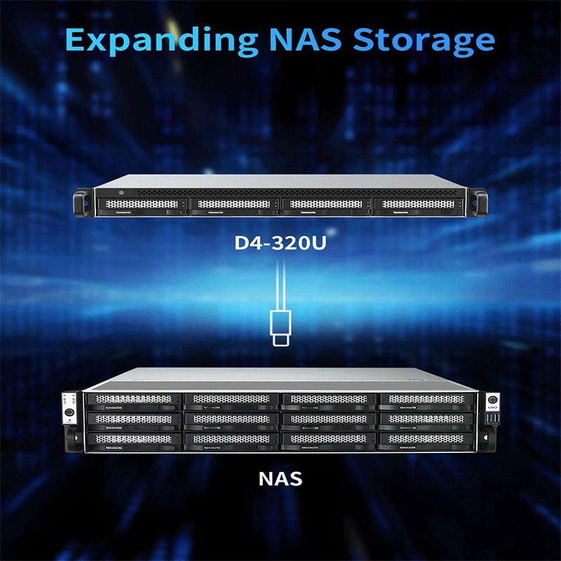 When paired with a compatible TerraMaster NAS, the D4‑320U can act as additional storage expansion (treated like external drives):