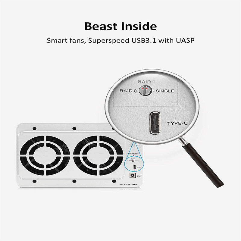 • Supports multiple RAID modes: RAID 0, 1, 5, 10, JBOD, Clone, Single Disk