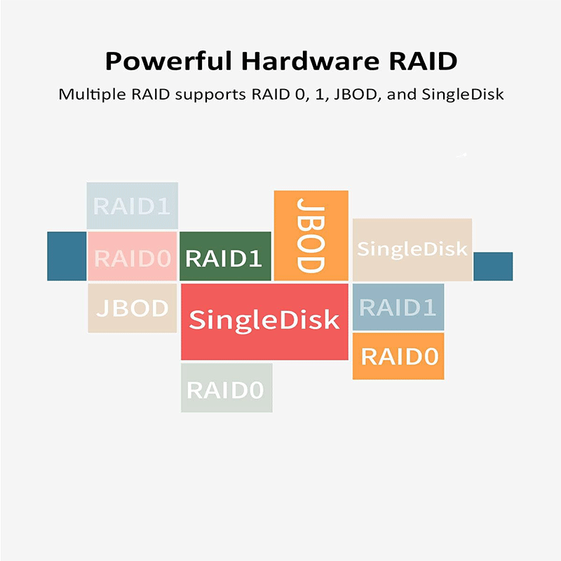 ✅ Why this matters: You can balance performance, redundancy, and raw storage however you want — e.g., a mirrored pair for critical files and standalone drives for extra backups or media storage. This isn’t possible in many basic enclosures.
