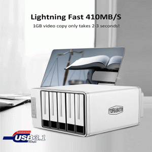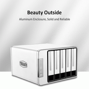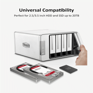 The enclosure supports up to five 3.5″ or 2.5″ SATA drives, accommodating large drives (up to 20 TB each). That means a potential total storage capacity of up to ~100 TB, depending on drive size and how you configure RAID.