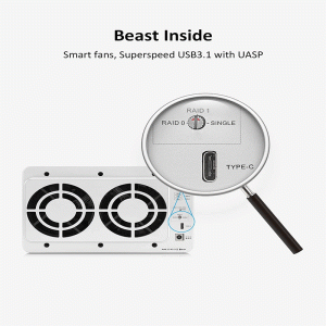 The enclosure uses a solid aluminum case and two smart‑controlled fans to dissipate heat quietly and efficiently.