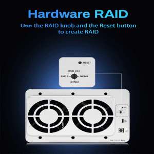 The D5‑310 includes a dedicated physical RAID mode selector on the enclosure, letting you switch between Single, RAID 0, RAID 1, RAID 5, and RAID 10 without software. This built‑in hardware RAID manages data distribution and redundancy at the device level, offering faster and more reliable performance than software‑based RAID solutions on a computer.