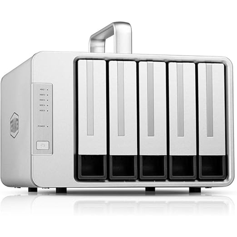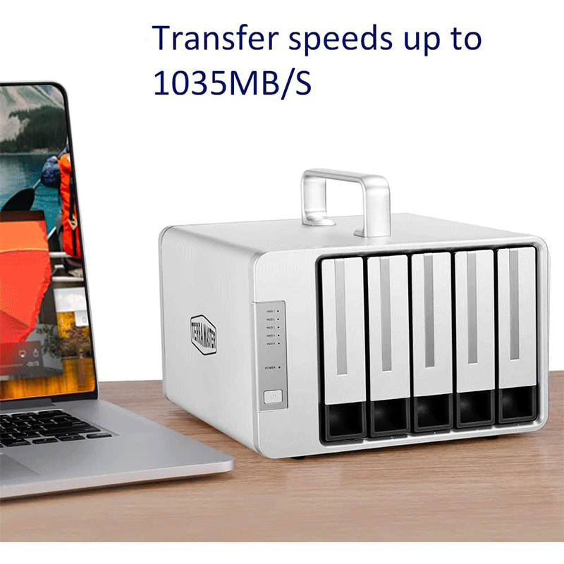 This enclosure holds five SATA drives (3.5″ HDDs or 2.5″ SSDs), allowing huge total capacity (up to around 80 TB with 16 TB drives). You can configure these drives in multiple RAID modes — such as RAID 0, RAID 1, RAID 5, RAID 10, JBOD, or Single Disk — depending on whether you want speed, redundancy, or maximum usable storage. The hardware RAID controller built into the unit handles these RAID configurations independently of your computer, which offers better performance and reliability compared to software RAID.