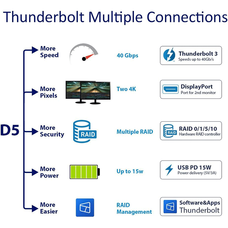 The D5‑Thunderbolt 3 uses Thunderbolt 3 connectivity (40 Gbps), which provides extremely fast data transfer between the unit and your computer. This means you can move large files — like 4K video footage or massive project libraries — much quicker than over standard USB connections. It’s ideal for workflows where speed matters, especially in creative and professional environments. Additionally, the Thunderbolt interface supports daisy‑chaining multiple devices, so you can connect up to six Thunderbolt peripherals in series using a single port.