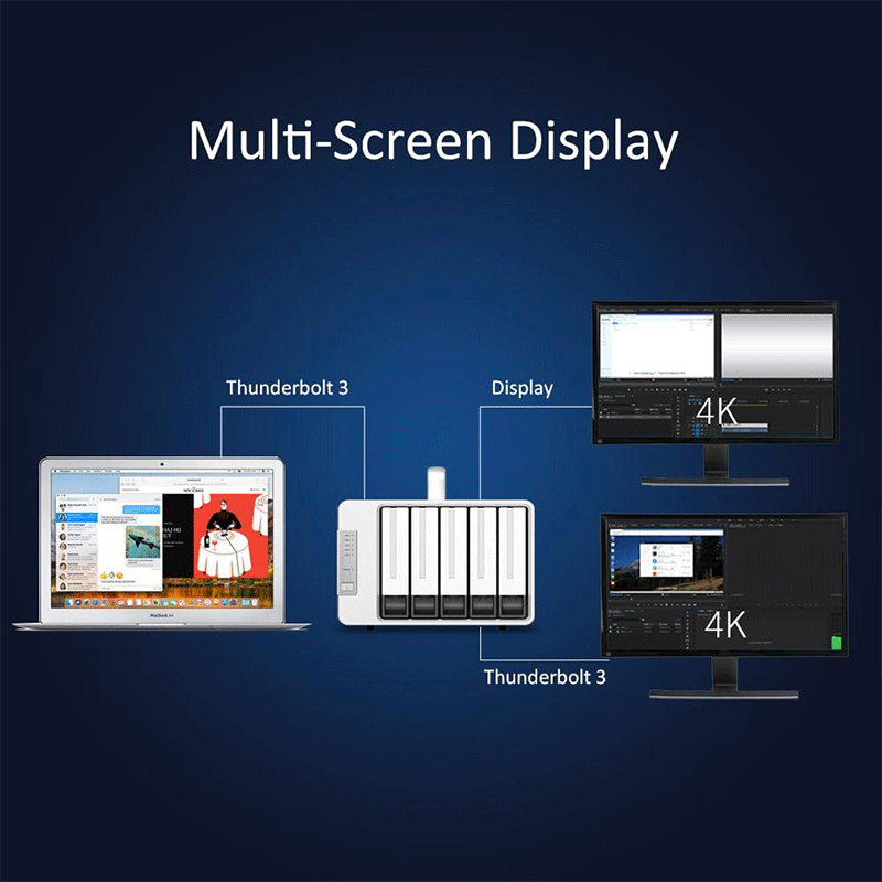 The unit includes a DisplayPort (DP) output in addition to its Thunderbolt ports. This lets you connect a 4K monitor directly to the enclosure, which is particularly useful for editors and content creators who want to offload display connections through a single device. The D5‑Thunderbolt 3 can even support up to three screens simultaneously using its combined ports — a helpful feature for multitasking workflows.