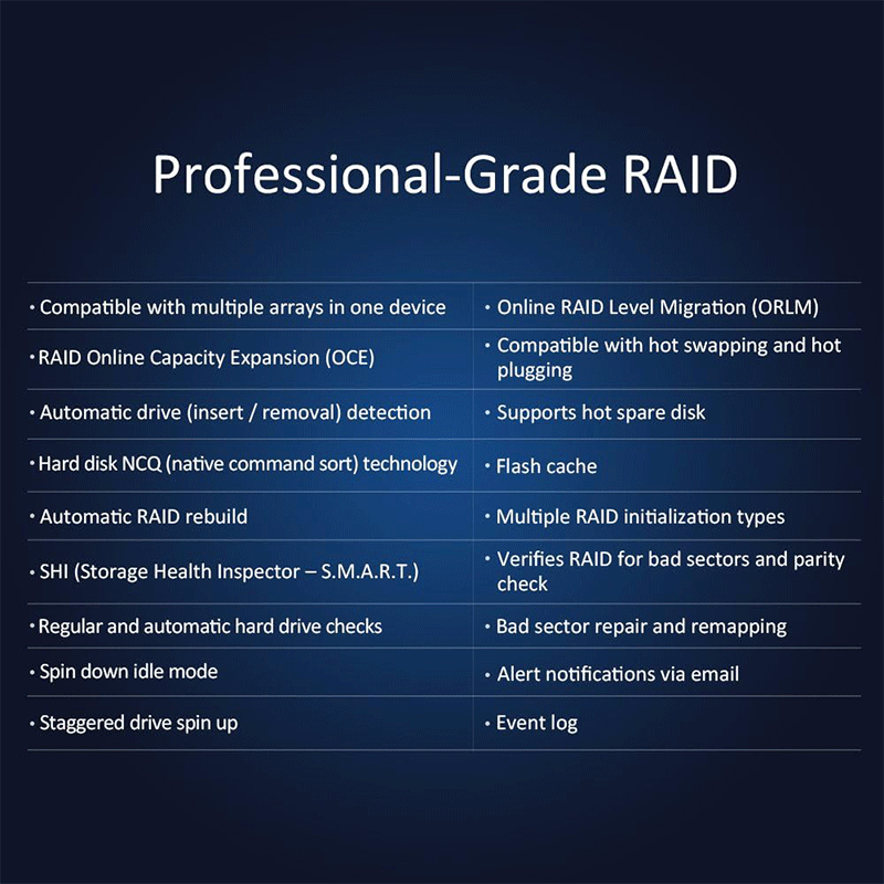 Auto RAID rebuild — if a drive fails, the system can restore it automatically once replaced.