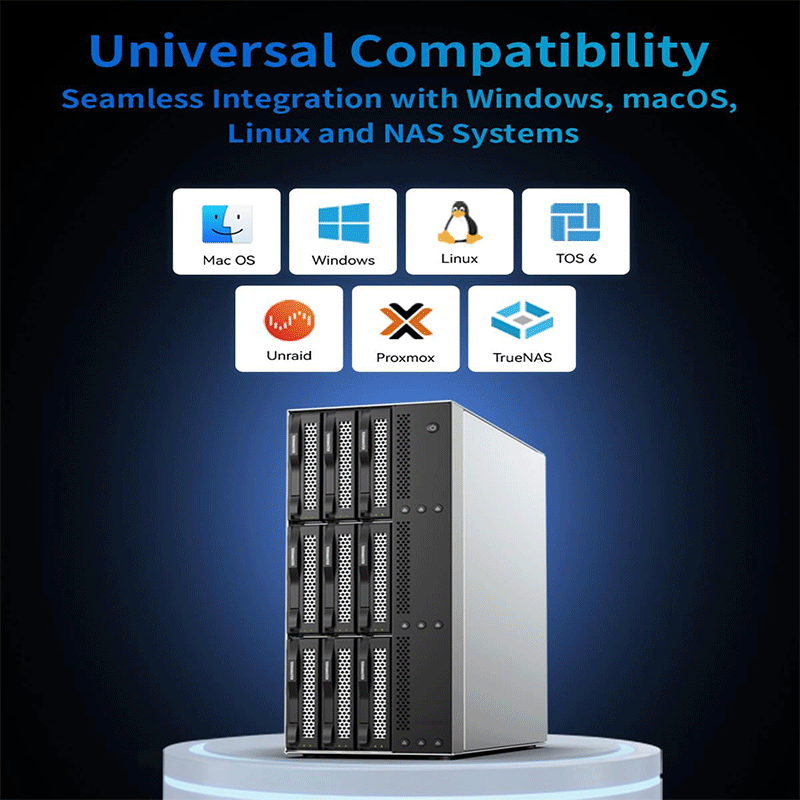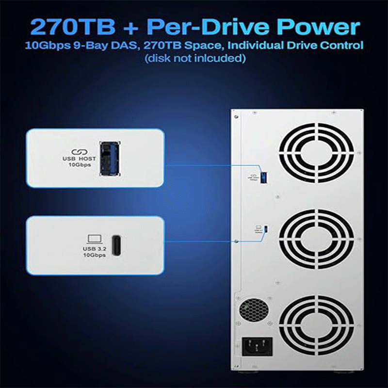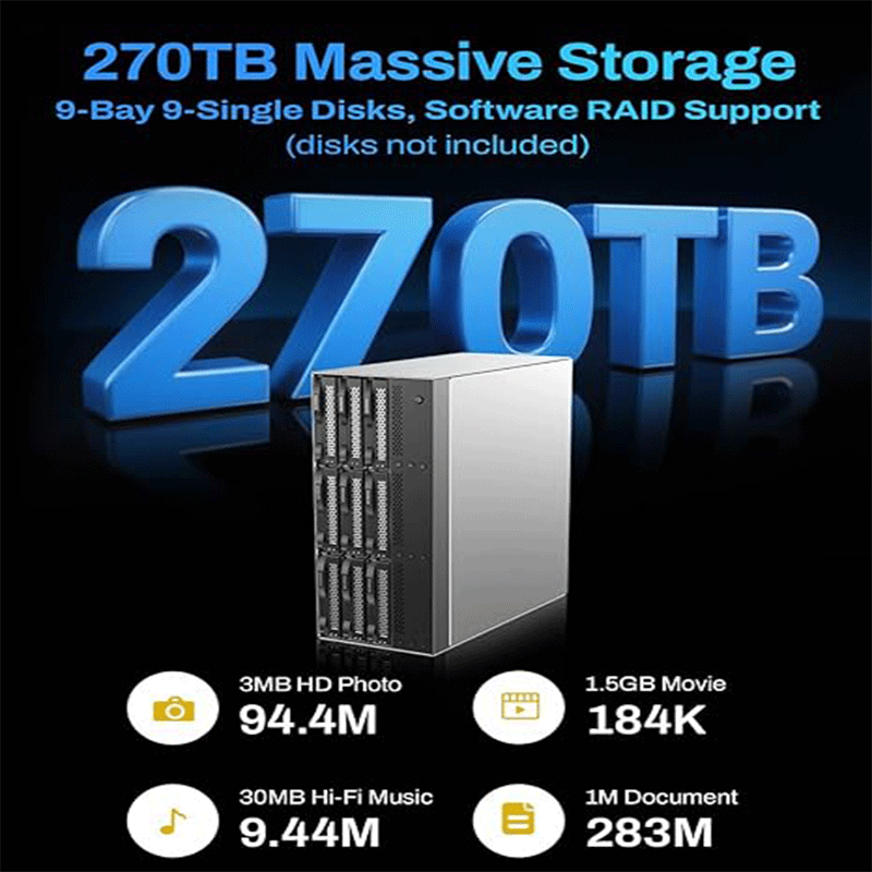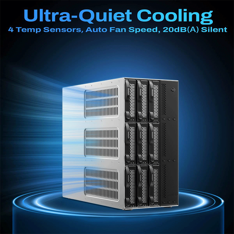 Massive storage expansion: Supports nine SATA drives (HDD/SSD), giving very high total capacity for media libraries, backups, and large data sets.