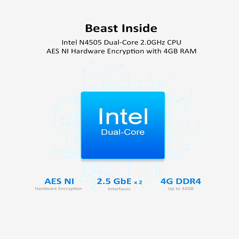 Processor: Intel® Celeron® N4505 dual‑core CPU (2.0 GHz base, up to 2.9 GHz) — capable of basic file services and 4K video tasks.