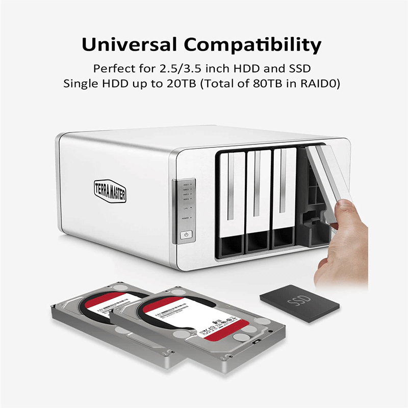 Supports multiple RAID levels (0/1/5/6/10, JBOD, Single) plus TRAID — TerraMaster’s flexible RAID‑like disk management that makes adding/upgrading disks easier.