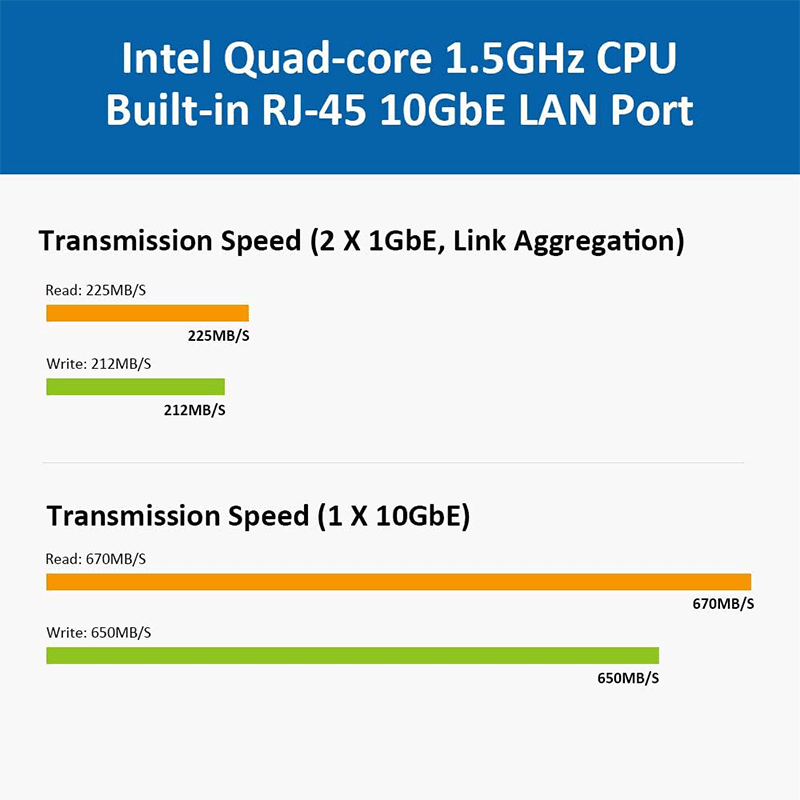Performance: Up to ~670 MB/s read/write over 10GbE (with RAID 5).