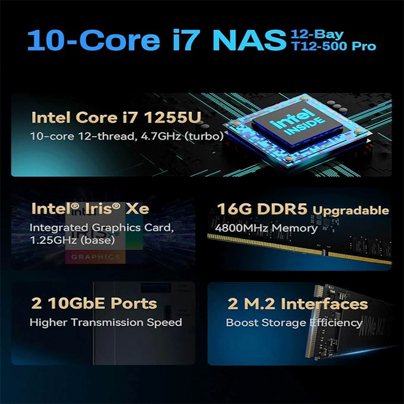 The TerraMaster T12‑500 Pro is a 12‑bay NAS (Network Attached Storage) server — essentially a high‑capacity, high‑performance storage system you connect to your network to store, back up, and share files. Its hardware and software are targeted at small to medium‑sized businesses, creative professionals (e.g., video production), and advanced home labs.
