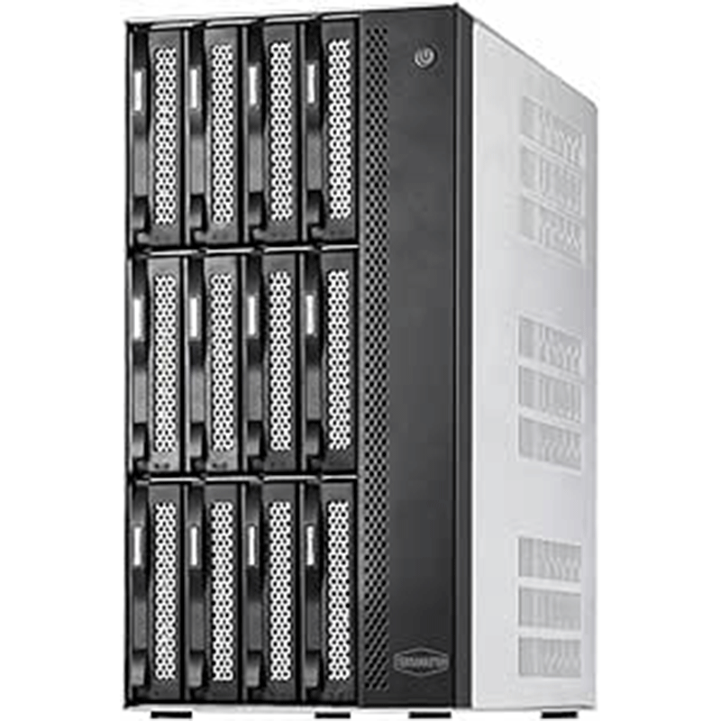 12 drive bays supporting 3.5″/2.5″ SATA HDDs and SSDs — huge capacity options.