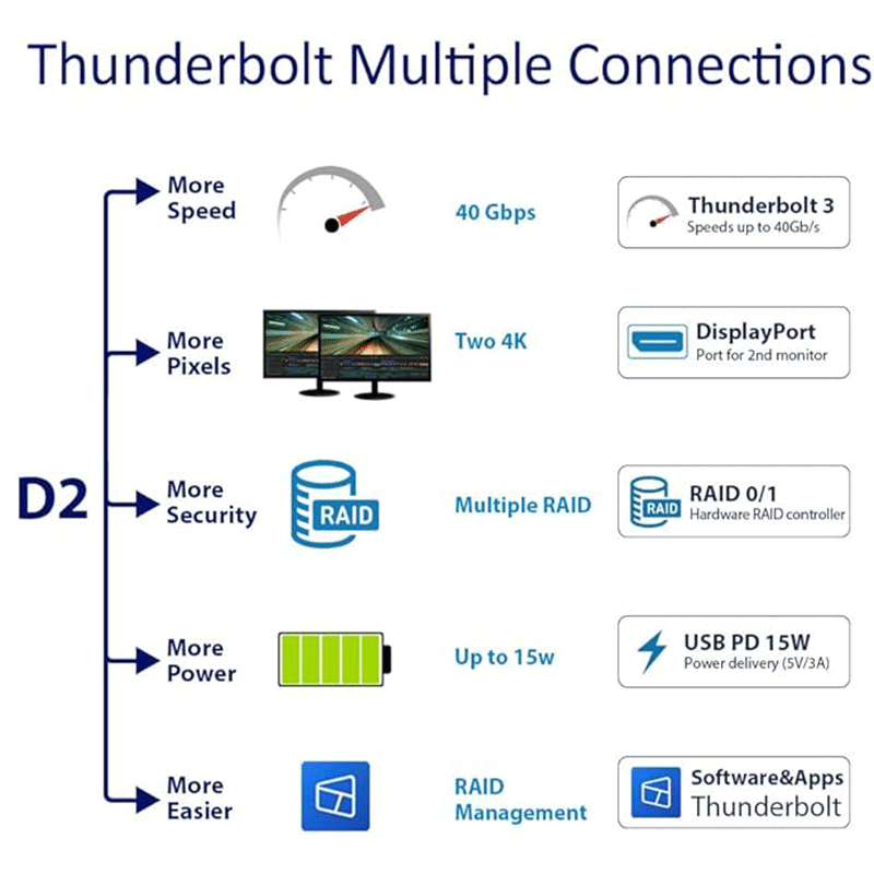 TD2 Thunderbolt 3 is equipped with two SATA hard drive slots. You can install two 3.5-inch or 2.5-inch hard drives or SSDs using these slots, offering a maximum storage space of 32 TB.