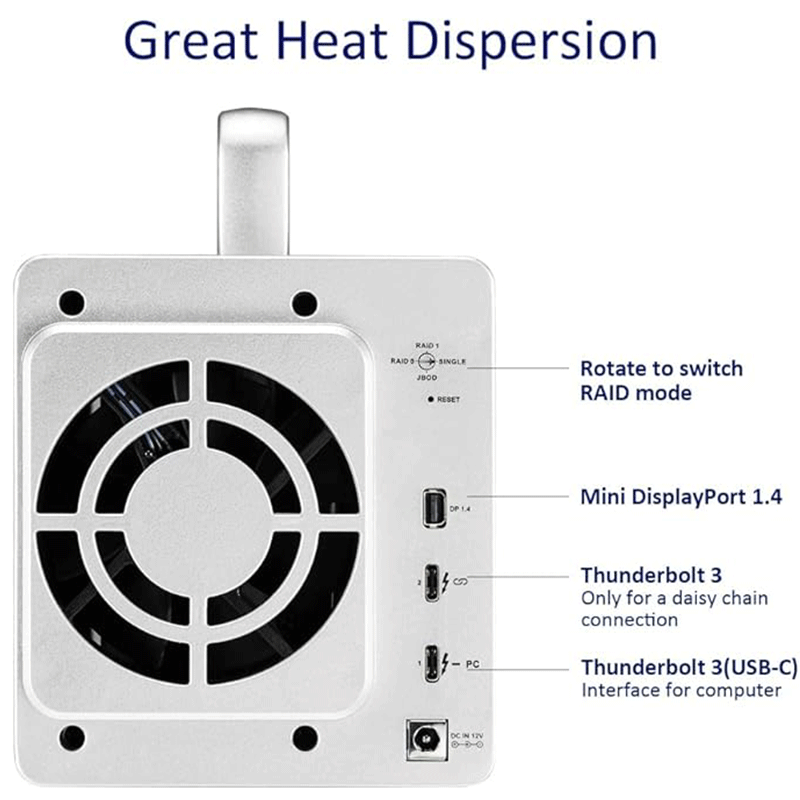 The TD2 Thunderbolt 3 features an intelligent power-saving system. It automatically enters sleep mode when your computer is off or in sleep, stopping only the hard drives and fan while keeping other functions active. When your computer powers back on, the device wakes up automatically. In the event of a power outage, TD2 Thunderbolt 3 will resume operation as soon as power is restored.