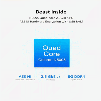 CPU: Intel® Celeron® N5095 quad‑core 2.0 GHz (up to 2.9 GHz) x86 processor with hardware encryption and 4K video transcoding support.